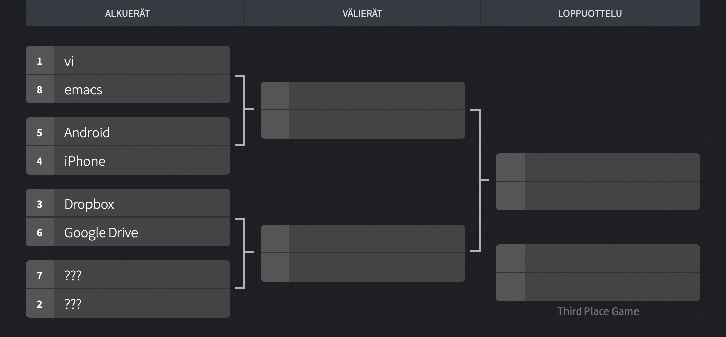Pudotuspeliosiossa vastakkain asetetaan Android ja iPhone sekä ratkaistaan ensimmäisen kierroksen vi vs emacs -ottelun kohtalo. Kerro miten puhelintaistossa pitäisi käydä esim. sähköpostilla osoitteeseen palaute@vikasietoti.la tai huutele meille muualla internetissä.
